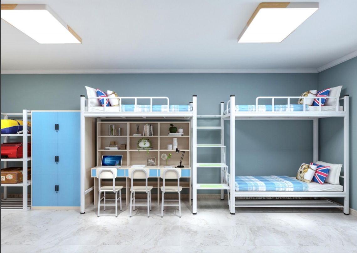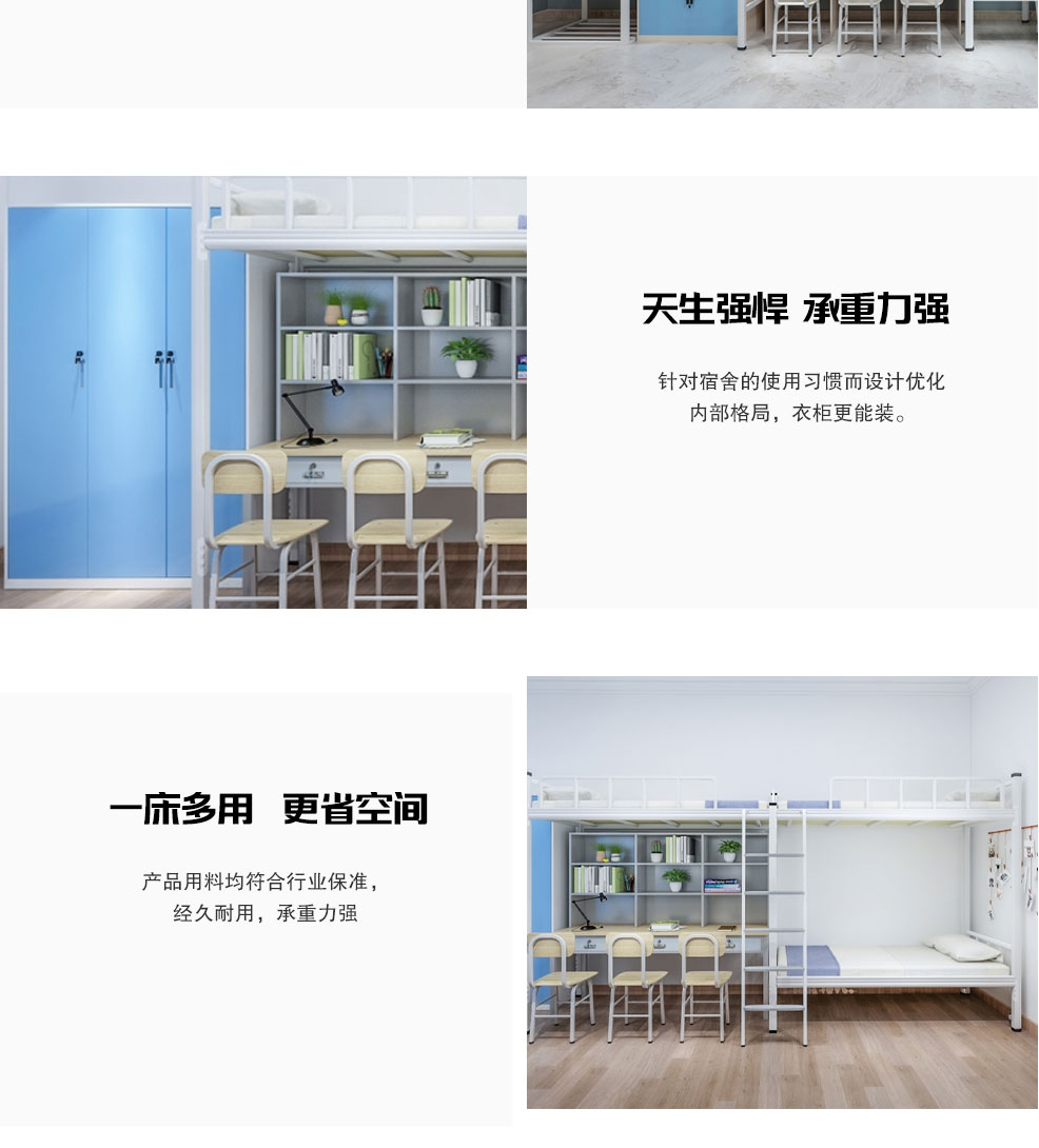 二連3人位公寓床1.整體規(guī)格:L4110*W900*H2120mm/2900mm,;2.邊立柱:采用(V65閉口型材),料厚1.2mm的閉口型管材,立面8個。立柱上下兩端口安裝工程塑料靜音內(nèi)塞,上端內(nèi)塞...